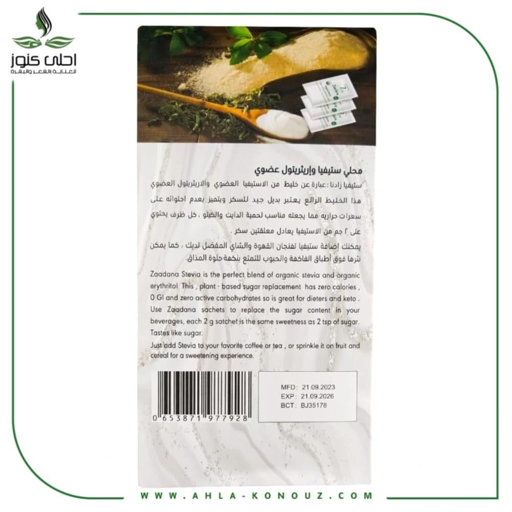 - كل ظرف (2 جم) = ملعقتين سكر في الطعم، لكن بدون أضرار.